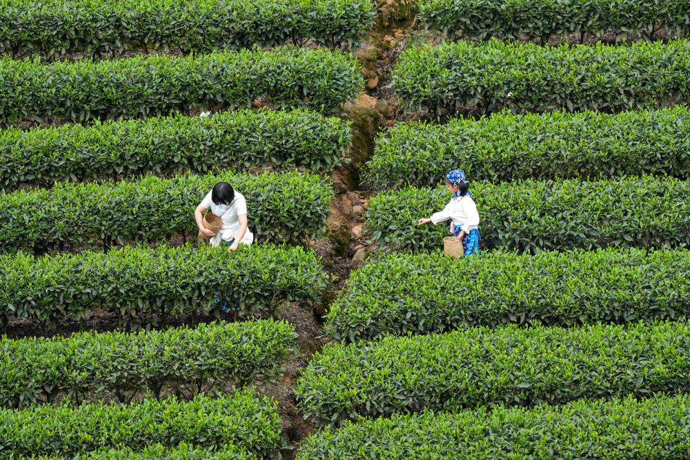 4月5日,东说念主们在四川省雅安市牛碾坪万亩不雅光茶园体验采茶。新华社记者胥冰洁 摄