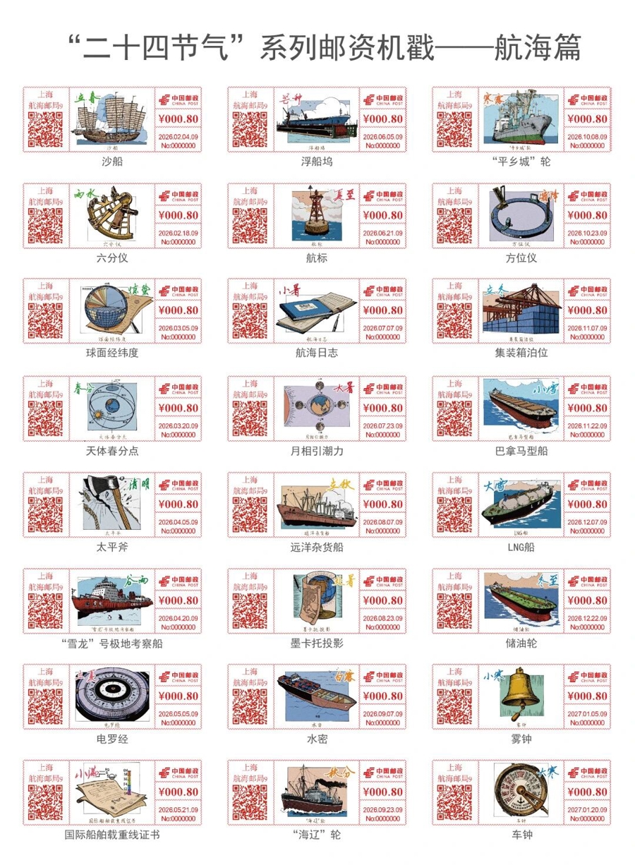 该系列机戳将共计发行24枚,以二十四节气的时序流转为脉络,每枚对应一个节气与航海元素,将节气物候特征、传统民俗与航海元素、航运历史深度融合,通过色彩与图案的巧妙搭配,在方寸之间展现“节气之美”与“航海之魂”。