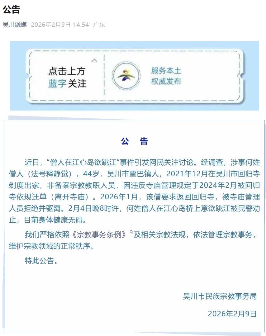 2026年1月,该僧条款复返操心寺,被寺庙处罚东谈主员隔断并驱离。2月4日晚8时许,何姓僧东谈主在江心岛桥上意欲跳江被民警劝止,现在躯壳健康无碍。