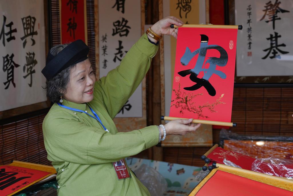 2月12日,在越南齐门河内的新春书道节现场,又名书道家展示汉字书道作品。新华社记者 刘颍 摄