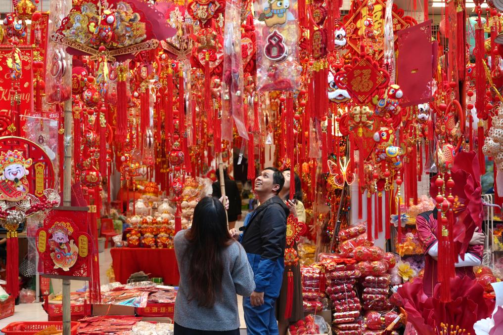 2月13日,顾主在越南齐门河内的马市街选购新春饰品。新华社记者 刘颍 摄