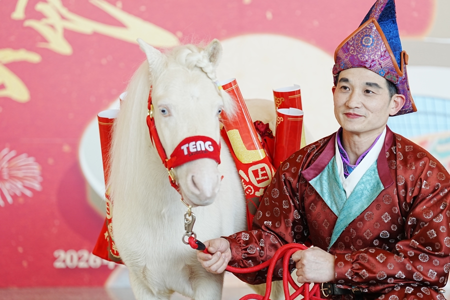 春节将近,上海马戏城已经满满马年新春吉祥氛围,两匹红色的充气小马迎接八方来客,今天更有“黑马王子”拉着南瓜马车在广场上供市民体验。新作《精灵宝盒的秘密》的演员穿着戏服,牵着一匹编了辫子的白色荷兰小矮马和市民互动合影。