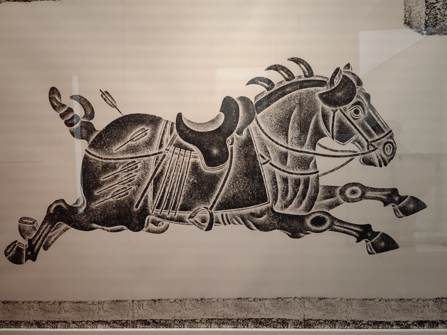“我们发现,跟马有关的中国古代艺术文物经常是有人的,人与马之间不是对抗的关系,而是一个和谐共处的关系。呈现这样一个展览,也希望城市里的人们来了解人类的这一好伙伴,以及文物背后的美好寓意。”上海博物馆展览部主任褚馨介绍,比如石刻昭陵六骏拓本描绘了唐太宗六匹战马的故事,其中“飒露紫”的石刻中就有人物形象。当时,李世民在邙山陷入重围,飒露紫胸前中箭,大将丘行恭立即下马,将自己的坐骑让给唐太宗,随即为飒露紫拔箭,石刻就描绘了这一情景。