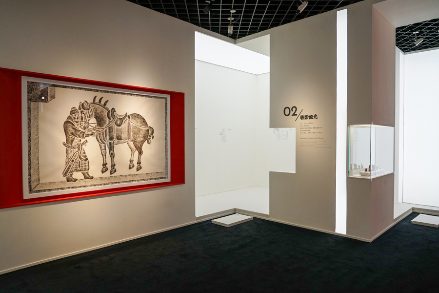 生肖展小而精,也为年轻策展人提供锻炼机会。此次展览布置上颇具特色,展厅整体以红黑白配色为主,彰显新春喜色,厅内回响声声马嘶和嗒嗒的马蹄声。展厅中心醒目的红色十字形风车结构配合六骏的奔马形象,让历史长河中马的侧影,在环绕的动线中跃然灵动。四角的L型展墙中段镂空,形成多样的观看角度与透景效果。此外,展厅轴线尽头将两个小小的“白盒子”分置左右,为参观体验增添更多趣味。