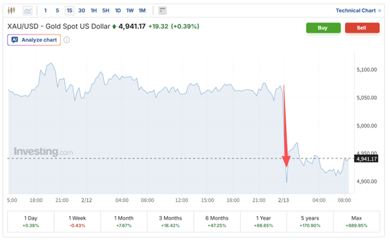 周四好意思盘时段,现货黄金30分钟内跌近200好意思元,跌幅一度高达近4%,跌破4900好意思元/盎司。