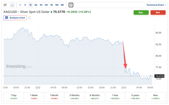 白银跌势更为惨烈,现货白银直线跳水跌超10%,价钱从约83好意思元/盎司跌至约75好意思元,创下2026年以来单日跌幅最大记载之一。